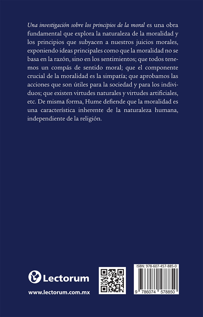 Una investigación sobre los principios de la moral es una obra fundamental que explora la naturaleza de la moralidad y los principios que subyacen a nuestros juicios morales, exponiendo ideas principales como que la moralidad no se basa en la razón, sino en los sentimientos; que todos tenemos un compás de sentido moral; que el componente crucial de la moralidad es la simpatía; que aprobamos las acciones que son útiles para la sociedad y para los individuos; que existen virtudes naturales y virtudes artificiales, etc. De misma forma, Hume defiende que la moralidad es una característica inherente de la naturaleza humana, independiente de la religión.